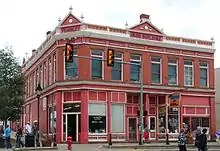 Richardsonian Romanesque[9] | The building's first occupant was the American National Bank. It has a 17-foot tower of red sandstone topped with a bell shaped metal painted dome.[18] |