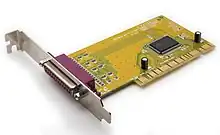 A parallel port implemented as a PCI card. Users can use expansion cards to add deprecated legacy ports to newer computer systems that do not provide them.