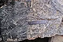 During the late Precambrian-early Cambrian, there was an accumulation of felsic volcanic rocks and argillite, a fine grained sedimentary rock. Regional metamorphism took place during the Paleozoic, along with compression of the area which resulted in an anticline. The original rocks were then intruded by the Lilesville Granite, which crystallized in place as the country rock was metamorphosed by the heat of the magma intrusion. This resulted in the formation of the contact aureole.[6] Mica gneiss xenoliths of various sizes can be found throughout the granite, especially near the contact with the aureole.[3] The Lilesville Granite was then intruded by the Pee Dee Gabbro, which can be confirmed by the presence of granite xenoliths in the gabbro.[1] During the Triassic, a system of normal faults including the Jonesboro fault cut through the area[7] and a period of sedimentation followed[8] and deposition of clastic rocks such as conglomerates, sandstones, and siltstones occurred. Then several dolerite dikes, thought to be late Triassic or Jurassic in age, intruded into the Lilesville Granite. The Lilesville Granite has been heavily weathered and is often covered by sediment where it outcrops.[3]