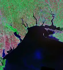 A liman (Russian: лиман; Romanian: liman) is an enlarged estuary formed as a lagoon at the wide mouth of one or several rivers, where flow is constrained by a bar of sediments, as in the Dniester Liman or the Razelm liman. A liman can be maritime (the bar being created by the current of a sea) or fluvial (the bar being created by the slowed or turned flow of a sediment-saturated river).[1] The term describes many wet estuaries in the Black Sea and the Sea of Azov; a synonymous term guba (губа) is used in Russian sources for estuaries of the Russian shores in the north.[2]