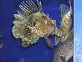 Pterois is a genus of venomous marine fish, commonly known as lionfish, native to the Indo-Pacific. It is characterized by conspicuous warning coloration with red or black bands, and ostentatious dorsal fins tipped with venomous spines.[3][4] Pterois radiata, Pterois volitans, and Pterois miles are the most commonly studied species in the genus. Pterois species are popular aquarium fish.[3] P. volitans and P. miles are recent and significant invasive species in the west Atlantic, Caribbean Sea and Mediterranean Sea.[5][6][7]