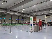 Terminal 2 is the much smaller, newer of the two terminals in the airport, used exclusively by low-cost carriers. It is located away from Terminal 1 on the southern border of the airport perimeter. It has 22 check-in desks (201–222), designated to each particular low-cost carrier, and 15 departure gates (201–215) using mainly walk boarding but also bus. There are only standard facilities, a few shops and service counters. The terminal is reachable via the free airport shuttle service from Terminal 1.[38] The users of Terminal 2 are Ryanair, Wizz Air, Transavia, Transavia France, Vueling, Eurowings and Norwegian.