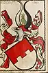 - ↑ Schild von Roth und Silber gespalten und darüber eine schwarze Zwergstrasse or Mauer mit vier Zinnen