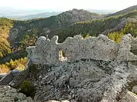 | Ustra castle | ![]() | Ustra is a castle in the eastern Rhodope Mountains in southern Bulgaria. Its ruins lie 4 km (2+1⁄2 mi) southwest of the village of Ustren situated on a hill at approximately 800 m (2,600 ft) above sea level. The fortress was built in the 10th century AD to protect an important trade route. It was taken by the armies of Simeon the Great (r. 893-927), but after his death, it was among the lands given back to Byzantium in return for recognition of the imperial title of the Bulgarian rulers. Between the 12th and 14th centuries, it frequently changed hands between the two empires, but the Byzantines held it most of the time. | ![]() |