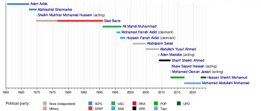 Mohamed Abdullahi MohamedHassan Sheikh MohamudMohamed Osman JawariMuse Sayyid HassanSharif Sheikh AhmedAden MadobeAbdullahi Yusuf AhmedAbdiqasim SaladHussein Farrah AididMohamed Farrah AididAli Mahdi MuhammadSiad BarreSheikh Mukhtar Mohamed HusseinAbdirashid ShermarkeAden Adde