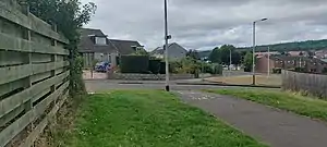 The two houses to the left of the foreground lamp-post mark the approximate location of the former Lochee West railway station. There is no evidence left of the station or that section of track.