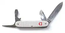 | Camper or Scout | The traditional camper or scout knife has four tools: a large drop point blade along with a can opener, combination cap lifter/slotted screwdriver, and an awl or punch. Many other combinations of large and small drop point blades, a Phillips-head screwdriver, saw, etc. are also considered camper/scout knives. | ![]() Victorinox Soldier, a Camper or Scout pattern pocketknife | |