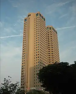 The Long-Bang Trade Plaza, also Long-Ban World Trade Building or Long-Bong Trade Plaza (Chinese: 龍邦世貿大樓; pinyin: Lóng bāng shìmào dàlóu), is a complex of twin skyscraper office buildings located in West District, Taichung, Taiwan. The buildings were completed in 1991 and were one of the earliest skyscrapers built in Taichung, as well as the first buildings to reach 150 m (490 ft) in the city. The height of each building is 160 m (520 ft), the total floor area is 70,389 m2 (757,660 sq ft), and each building comprises 37 floors above ground, as well as five basement levels.[1] The complex was designed by TMA Architects and Associates.[2] As of December 2020, the buildings are the 11th tallest buildings in Taichung.[3]