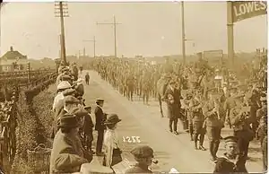 The 4th Battalion Suffolk Regiment marching from Lowestoft North to its camp along the Yarmouth Road; the tram standards and rails of Lowestoft Corporation Tramways can be seen.