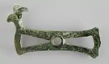 Other types include bronzes centred on a large ring, mostly decorated with animals in way similar to the finials and cheekpieces. These perhaps were part of horse-harnesses.[41] Large socketed pieces are assumed to be handles for whetstones.[42] Other pieces made from sheet metal include sheets for the front covers of quivers, typically divided vertically into registers with small scenes.[43] There are cups and situlae, both with rounded bottoms. Weapons are common, including a type of "spiked axehead" with spreading strips or spikes behind the axehead; these are also found in miniature votive versions.[44] Some examples seem to have had "spikes" that were designed to be functional in combat, others perhaps not.[45] A kind of long "halberd-axe" has the head of an animal perched at the top of the blade, and spikes on the other side. Pieces of bronze jewellery such as rings, bracelets pendants and arm or anklets are also found.[46]