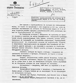 Letter from Bulgarian Education Minister Kiril Dramaliev dated 18 February 1949 informing the General Secretary of the Central Committee of the Bulgarian Communist Party and Prime Minister Georgi Dimitrov that the students from Pirin Macedonia do not want to study the newly codified Macedonian language.[5]