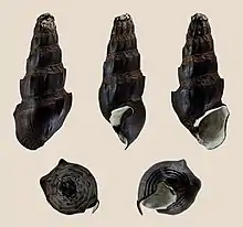 The shell is elongate and large and it has 5.0-11.0 whorls.[3] The color of the shell is from brown to black.[3] The apex is truncated.[3] There are axial ribs especially on upper whorls.[3] The aperture is widely oval with palatal and basal sinus.[3]