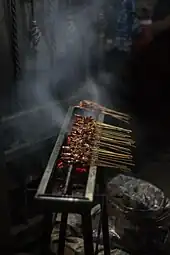 For the Madurese people, their traditional cuisine is characterized by a fairly large use of meat; of which primarily prepare miniature skewers called satay accompanied with special sweet marinade and thick sharp sauce made from peanut, has enjoyed a wide popularity in many parts of Indonesia. In addition, traditional Madurese culinary are characterized by the active use of corn and, in general, greater salinity and spiciness of dishes compared to other regional cuisines of the country.[25]