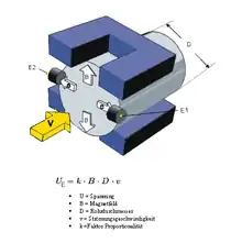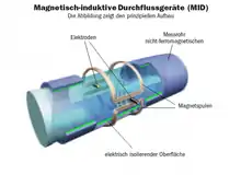 A magnetic flow meter (mag meter, electromagnetic flow meter) is a transducer that measures fluid flow by the voltage induced across the liquid by its flow through a magnetic field. A magnetic field is applied to the metering tube, which results in a potential difference proportional to the flow velocity perpendicular to the flux lines. The physical principle at work is electromagnetic induction. The magnetic flow meter requires a conducting fluid, for example, water that contains ions, and an electrical insulating pipe surface, for example, a rubber-lined steel tube.
