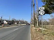 The Camden, Ellisburg, and Marlton Turnpike was chartered in 1849 as a turnpike that was to run from Camden east to Marlton along what is today Route 70 and CR 601.[9] The Marlton Pike was taken over by Camden County in 1907 at a time many other turnpikes became public roads.[10] The current alignment of Route 70 between Whitesbog (the west end of the CR 530 concurrency) and Lakehurst was legislated as a part of pre-1927 Route 18 in 1923, a route that was to run from Camden to Toms River.[11] In the 1927 New Jersey state highway renumbering, Route 40 was designated to run from Camden to Lakewood along the current alignment of Route 70. In addition a spur of this route called Route S40 (now Route 72) was designated to head from the route at Four Mile to Manahawkin.[12][13] Eventually, the eastern terminus of Route 40 was moved to the Laurelton Circle in Brick Township, where it intersected Route 35 (now Route 88) as well as Route 34, which continued north from this point. The western terminus was placed at the Airport Circle with US 30 and US 130 in Pennsauken, ending concurrent with Route 38.[14] In the 1953 New Jersey state highway renumbering, Route 40 was renumbered to Route 70, to avoid conflicting with US 40 in the state. Also, Route 70 was designated onto its current alignment between Route 38 in Pennsauken and Route 34 and Route 35 at the Brielle Circle, removing the concurrency with Route 38 and replacing the portion of Route 34 between the Laurelton Circle and the Brielle Circle.[15][16]