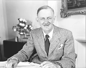 Boyd seated at his desk in his home, "Plumstead", near Cambridge, England, 1947