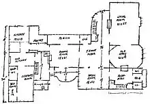 As designed by Richardson, the house was a two-story L-shaped wood-frame structure, with its main entrance to the left of a recessed porch facing Brattle Street. A side entrance is on the east side of the house, facing Ash Street. The exterior, in a departure from Victorian forms featuring sometimes extensive and elaborate decorative sawn woodwork, is restrained, with most surfaces covered with wooden shingles. The entry leads into a central hall at the crook of the L, which includes a sweeping semicircular staircase leading to the upper floors. From this hall access is gained to most of the public rooms on the ground floor, including a drawing room, music room, study, and dining room. The dining room is to the right of the entrance, with access to the formerly-recessed porch, which has been glassed in. Beyond the dining room to the right is the service wing, including the kitchen and laundry, later converted into a garage, and then again merged into the house proper. Behind the dining room, now filling in the crook of the L, is a conservatory.[2]