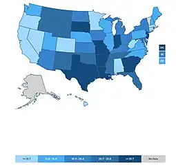 Race also plays a role in maternal mortality. In 2021, the maternal mortality rate for Black women was 69.9 deaths per 100,000 live births.[8] This is 2.6 times the rate for White women.[2] Approximately 1 in 6 Black infants were born in maternity care deserts and 1 in 4 of Native American babies were born in maternity care deserts.[2] Native American women are 2–3% of the population, and 13% of them gave birth in a maternity care deserts[3]