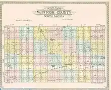 The Dakota Territory legislature created the county on March 9, 1883, with areas partitioned from Campbell, Logan, and McPherson counties, and with some previously unorganized areas. It was named for Edward H. McIntosh, a territorial legislator at the time.[3] The county seat was originally Hoskins, but changed in 1888 after everything in Hoskins but the school was moved three miles east to the new Soo Line Railroad townsite of Ashley.[4] The county government was not organized at that date, but the new county was not attached to another county for judicial or administrative purposes. Its government was organized on October 4, 1884.[5]