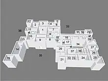 Mentmore, the ground floor; many of the rooms named for the collections they once contained. 1:Grand Hall; 2:White Drawing Room; 3:Dining Room; 4:Library; 5:Amber Room; 6:limoges Room; 7:Imperial staircase; 8:Study; 9:Vestibule; 10:Green drawing Room; 11:South Entrance Hall; 12:Blarenberghe Room; 13:du Barry Room; 14:Billiards Room; 15:Smoking Room/Armoury; 33: Italian garden; 34:Servants' courtyard; 35:Cour d'honneur; 36:South Terrace; ST:minor service staircases. For other rooms, please see Servants' quarters