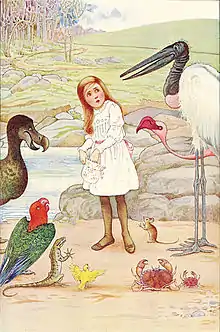 Sowerby was among the earliest women to illustrate Lewis Carroll's Alice's Adventure's in Wonderland, originally published in 1865.[3] In 1907, the book entered the public domain in the United Kingdom, and that year at least eight new editions were published, with Sowerby's being the first of the new lot to appear.[6] A collective review in The Academy of the 1907 editions – while regarding her rendition of the mad-hatter's tea party her best illustration, and Father William replying to his son her best use of color – opined "Sowerby attempts work rather too difficult for her, and she has not much imagination".[7] Her artwork in Childhood, written by her sister Githa, however, was regarded as "much better" than her work in Alice: "The bistre drawings have a charming effect, and [Sowerby] has a pretty fancy."[8]:217 Her illustrations of Robert Louis Stevenson's A Child's Garden of Verses were received as "characteristically excellent",[2] and a 1911 review of three books produced with Githa proclaimed "Millicent Sowerby is Kate Greenaway come to life again."[9]