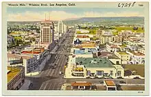 Miracle Mile viewed from south. Wilshire Blvd. runs left-to-right, lined with tall buildings.