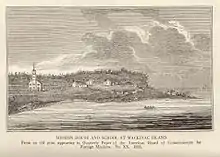 Christian missions were often the first outposts of European colonization of the North American frontier. The United Foreign Missionary Society founded a Protestant mission on Mackinac Island in 1822.[13] The objective was to train Indian youth as teachers of English, Christianity and majority American ways, and as interpreters. To support this mission, the US government transferred 12 acres at the southeast end of the island to the Society.[13] The Connecticut Missionary Society sent Rev. William Montague Ferry to the island, and he opened the school with twelve Indian children on November 3, 1823. He was assisted by his wife Amanda White Ferry and Elizabeth McFarland. The school building was framed and enclosed by workers from Detroit, using timbers obtained from a sawmill on Mill Creek (6 mi SE of current day Mackinaw City). By 1825, construction of the 2-story ‘Mission House’ was completed by Martin Heydenburk, one of the school's teachers. Because the island had no Protestant church, the east wing of Mission House was fitted with a movable partition so that on Sundays it became a chapel. Enrollment soon averaged 150 Native American pupils per year with >100 receiving free board, room, and clothing from the mission family. The southeast point of Mackinac Island became known as Mission Point.[14][1]