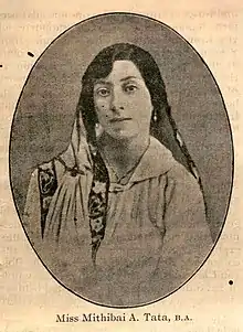 Mithan Jamshed Lam, née Mithan Ardeshir Tata, was born on 2 March 1898[5] in the western Indian state of Maharashtra, in a Parsi Zoroastrian family,[6] to Ardeshir Tata, a textile mill employee and Herabai Tata, a women's rights activist.[7] Her childhood and early education were at Phulgaon, in Pune district, where her father was working at a local textile mill, but later, she moved to Ahmedabad when her father shifted his job to that place.[2] Soon, she came to Mumbai, where she joined Frere Fletcher School (present-day J.B. Petit High School for Girls) to complete her school education. Her graduate studies were at Elphinstone College, Mumbai and she secured her degree in economics with honours, winning the Cobden Club Medal, for standing first in Economics.[2] It was during this time, she accompanied her mother to London for appearing before the Southborough Franchise Committee, headed by Francis Hopwood, 1st Baron Southborough.[7] During the visit, she also had opportunity to discuss the topic of Woman suffrage in India with the members of the House of Commons. Deciding to stay in England, she joined London School of Economics to successfully complete her master's degree, simultaneously studying law to qualify as a Barrister-at-Law of Lincoln's Inn in 1919,[8] becoming one of the first woman barristers and the first Indian woman barrister.[9] Her stay in England also gave her opportunities to get associated with notable Indian woman leaders such as Sarojini Naidu and Annie Besant, who were also there in the country to advocate for woman suffrage in India. She visited Scotland, along with these leaders, and also addressed the House of Commons. The efforts were reported to have assisted in getting the suffrage to Indian women.[2]