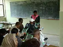 Later on, there was need for modern public education in the early beginning of the twentieth century, with absence of Church and Quran education to satisfy the demands or needs of political, economic, foreign relations, maintaining the sovereignty of the country.[11] This was influenced by centralized government since 19th century and Ethiopia's strong diplomatic ties with other world, the Franco-Ethiopian Railway and the introduction of infrastructure.[12] European languages such as French, Italian, English as well as native language Amharic dominated the curriculum to the field like mathematics, science, physical training, and sports.[13]