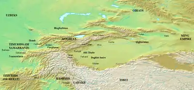Chagatayid rule in Moghulistan was temporarily interrupted by the coup of the Dughlat Amir Qamar-ud-Din, who likely killed Ilyas Khoja in 1368 and several other Chagatayids. This takeover provoked a period of near-constant civil wars, because the tribal chiefs could not accept that Qamar-ud-Din, a "commoner", could accede to the throne. Opposition to Qamar-ud-Din within his own Dughlat tribe compromised the unity of Moghulistan, as Mirza Abu Bakr Dughlat took control of Kashgar.[2] The Moghuls that remained obedient to him were constantly at war with Timur, who invaded Moghulistan several times but was unable to catch Dughlat invaders.[17] Timur sent at least five victorious expeditions to Moghulistan, seriously weakening Qamar-ud-Din's regime. The Moghuls had sent an unsuccessful supplication to the Hongwu Emperor of China pleading for help, as Tamerlane had also wanted to conquer China,[2] while emphasizing that Transoxiana was the land belonging to their own Moghul forefathers, regarding the Timurids control over Transoxiana as illegitimate.[18] Although a military alliance did not result, the Ming dynasty opened up caravan trade to Moghulistan, greatly enriching the Moghul rulers who collected zakat (tax) on the lucrative Silk Road trade.[19] This trade ushered in an era of economic and cultural exchange with China, in exchange for the state accepting (what the Ming saw as) tributary status to the Ming.[5]