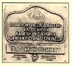 Memorial plaque commemorating Vladimir Rusanov's expedition which was lost in this area of the Kara Sea. This plaque is located in Gerkules Island, which is named after Rusanov's ship.