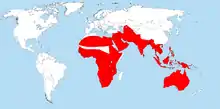 The various species cover a vast area, occurring through Africa, the Indian subcontinent, to China, the Ryukyu Islands in southern Japan, south to Southeast Asia to Thailand, Malaysia, Brunei, Indonesia, the Philippines, New Guinea, Australia, and islands of the Indian Ocean and the South China Sea. They have also been introduced outside of their natural range, for instance, the West African Nile monitor is now found in South Florida.[11] Monitor lizards also occurred widely in Europe in the Neogene, with the last known remains in the region dating to the Middle Pleistocene.[12]