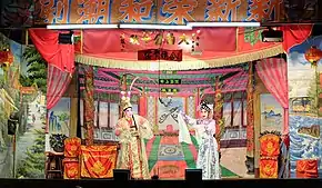 There are speakers of various dialects amongst the Chinese population, such as Hokkien, Hakka, Cantonese, and Teochew, and different dialect speakers may have their own clan associations which support their respective forms of opera. Opera troupes were first formed by amateur music clubs; the earliest amateur music club in Singapore is the Er Woo Amateur Music & Dramatic Association (馀娱儒乐社) set up in 1912 by Teochew businessmen, initially to promote music of the Hakkas (Hanju opera and Handiao music), later also Teochew opera.[10] A number of recordings of Hanju opera performed by Er Woo were made in the 1920s and 1930s. Many professional and amateur opera troupes that performed in various dialects were later established.[11] These opera troupes typically perform during festivals and national events, and may also hold regular small-scale performances, or large-scale ones annually or biannually.[12] The professional troupes may also perform in opera theatres.[13] During Chinese festivities there was also a minstrel tradition called zouchang (walk-sing), which involves walking performance by members of the operatic troupes. In the past, makeshift stages often appeared during festivities along the streets where operas may be performed. However, operas have declined as popular entertainment in the latter half of the 20th century; opera theatres closed, and street opera have mostly been replaced by getai where modern songs and comedy routines are performed,[1] although street opera is still performed by professional and amateur opera troupes.[13]