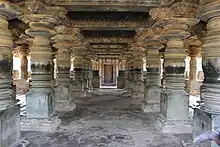 The Nagareshvara Temple, (also spelt Nagaresvara or Nagareshwara) also called the Aravattarukmbhada Gudi (lit, "Temple with sixty six columns") is a 12th-century Western Chalaukya (also called Later Chalukya or Kalyani Chalukya) construction. Bankapura is located in the Haveri District of Karnataka state, India. According to the Archaeologist Henry Cousens (1854–1933), during medieval times, the Bankapura fort was considered one of the most important fortifications in the Karnataka region. According to Cousens, the temple suffered much damage when Bankapura fell to the armies of Firoz Shah Bahamani in 1406 CE and later again when it was occupied by the Bijapur Sultan Adil Shah. According to the writings of Farishtah, the Sultan "ordered a superb temple within the fort to be destroyed". However, despite much pillage, the large temple with its majestic "great" hall (mantapa) still retains some of its original beauty.[1] That the temple was built in honor of the Hindu god Shiva comes from two short inscriptions in the temple which begin with a salutation to "Shambu" (another name for the Hindu god Shiva). There are other inscriptions in the temple, two of which are dated 1138 CE and one dated 1091 that record grants to the god "Nagaresvaradeva".[2] The temple is protected as a monument of national importance by the Archaeological Survey of India.[3]