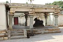 Nandi mantapa in Nageshvara temple. The Nageshvara temple complex photo is located in Begur, a small town within the Bangalore urban district of Karnataka state, India.