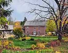 The Old Spring Tavern at 3706 Nakoma Rd is the oldest surviving building in Nakoma. It was built in 1854 by Charles Morgan at a spot along the old Madison-Monroe stage road where an ample spring (now the duck pond) supplied water for horses. It was built with pink bricks made from clay dug nearby.[7] Greek Revival style was popular for new buildings from 1825 to 1860.[8] Hallmarks of the style in this building are the low-pitched roof with cornice returns, the symmetry, and the plain window sills and lintels. James Gorham bought the inn in 1860 and it served that role until 1895, when it was remodeled into a private home. The porch across the front was added in 1925.[7]