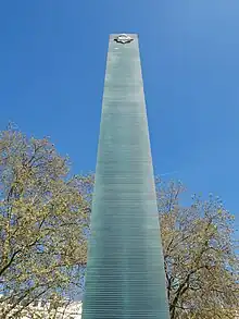 Immediately north of the block, a glass column is sited in a reflecting pool. The column is internally illuminated by fibre optic cables with a faint blue light,[15] symbolising the blue lamp which traditionally hangs outside police stations in the United Kingdom.[14] The column is intended to screen the vitrine from passing traffic on The Mall. The column is 7.4 metres (24 ft) high, consisting of 622 stacked sheets of glass, a total surface area of 954 square metres (10,270 sq ft), weighing 28.6 tonnes.[15]