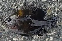 Adults of this species can grow up to a maximum length of up to 13.5 centimetres (5.3 in).[1] They have 13 dorsal spines, 15 to 16 dorsal soft rays, 2 anal spines, and 13 to 15 dorsal soft rays.[1] Like most species of the genus Neoglyphidodon, juveniles and adults of this species have different colouration. Adults are black. Juveniles are orange or yellow with a black spot around their dorsal fin. Around that black spot, it has a blue circle around it. There is usually a blue pattern of lines that extends from its eye towards the black spot.