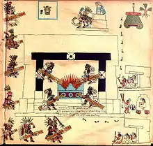 The Templo Mayor, which was the temple in the Aztec capital Tenochtitlan, was largely important to the New Fire Ceremony because there the ceremonial fire was taken to the top of the pyramid and lit inside the Temple of Huitzilopotchli.[8] The position of every part of the ceremony was carefully chosen to either mirror what was happening in the sky or to please the gods or both. When the priest would wait for the constellation to move, that was the signal that all would be well and that is when he would start the fire on the sacrifice's chest. This ritual sacrifice took place on Huixachtlan which was a large, ceremonially important mountain and the first temple to receive fire from the new fire. Both of these places show that the New Fire Ceremony was closely tied to their understanding of astrology and their gods.[7]