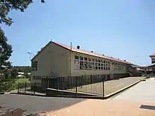 Instead, in 1954 a timber Boulton & Paul Building was constructed, comprising two classrooms (now called Block B).[69][70] Responding to materials shortages and the pressures of the baby boom, the Department of Public Works imported a British prefabricated building system from manufacturers Boulton & Paul Ltd of Norwich. Based on an 8-foot (2.4 m) planning and construction module, the prefabricated elements in the Boulton & Paul system included wall panels, ceiling panels, roof trusses and banks of awning windows. The buildings were constructed at many schools across Queensland between 1952 and 1958.[71][72] Boulton & Paul buildings were timber-framed and clad, had a verandah as circulation, and a gable roof. Ideally, they were orientated so the verandah faced north and the classroom faced south but were also added as extensions to existing buildings regardless of orientation. The building could be high or low-set and had extensive areas of timber framed awning windows, providing more glazing than had ever been used in Queensland classrooms; almost the entirety of the verandah wall and the opposite classroom wall were glazed, providing excellent natural ventilation and lighting. The classrooms were 24 by 24 feet (7.3 m × 7.3 m), larger than most previous classrooms.[73] The flexibility of the system meant that the number of classrooms constructed could vary to suit the needs of a particular school. In some cases, Boulton & Paul classrooms were used to form long, interconnected blocks, such as at Geebung State School (1951–55), Dalby State High School (1954) and Indooroopilly State High School (1953-54).[74][75][76][1]