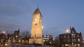 It is a Grade II listed[3] building in the form of a red-brick tower[2] clad in Portland stone,[1] with four 2.06 metres (6.8 ft) diameter,[1] illuminated clock faces.[3] There are decorative wrought iron and bronze gates and lamp standards.[3] It was designed by Thomas Worthington & Sons, of Manchester,[1] with tablets designed by The Birmingham Guild of Artists.[1] It was built by Messrs E & A Frith of Macclesfield and Mr Thomas Grace of Leek.[1] The ironwork was made by a blacksmith called Mr Hart, of Salford.[1]