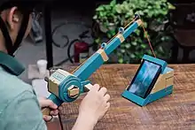 Nintendo Labo developers Kawamoto, Sakaguchi, and Ogasawara stated in an interview that their goal was to use the unique features of the Nintendo Switch in such a way that no other system could emulate. The Joy-Con were treated as a "bundle of sensors" that could be used in a multitude of ways by attaching them to different hardware pieces, focusing on the gyro motion-sensor, IR motion camera, and HD Rumble features.[40] The team was tasked with exploring Joy-Con attachment and game prototypes during three weeks of brainstorming sessions, called "prototype parties."[41][42] When asked about the choice of building material, the developers responded by saying that cardboard was chosen over plastic because the 3D printer they were using for prototyping was unable to keep up with their pace of testing; cardboard would also allow for the player to create, repair, and customize the project themselves.[17] The initial construction designs were first thought as being simple to construct, but later proved to be complex and challenging when it was decided that no cutting or gluing would be required to assemble the kits. Improvements were made to the prototypes based on feedback from consumer and developer testing; this prompted the creation of the interactive instruction software, as well as favoring simplicity over appearance. During development testing—prior to the cardboard designs being finalized—photographs were taken and compiled into booklets to be used as temporary instruction manuals; these booklets ranged from 1,000 pages for simpler models to 3,000 pages for complex ones.[43] While the cardboard Toy-Con are sturdy, Nintendo recognized that the cardboard can suffer wear and tear with time, and sells replacement sheets for individual Toy-Con through its online store.[2][6][7] When asked about the durability of Labo during an interview with CNET, Yoshiyasu Ogasawara stated, "We tested their resilience to the same action through hundreds and thousands of repetitions, so we expect them to last a long time under normal use."[44]