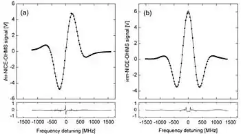 Some typical Doppler-broadened NICE-OHMS signals, from 13 ppb (10 μTorr, 13•10−9 atm) of C2H2 detected in a cavity with a finesse of 4800, are shown in the figure. (a) fm- and (b) wm-signal. Individual markers: measured data; Solid curves: theoretical fits.