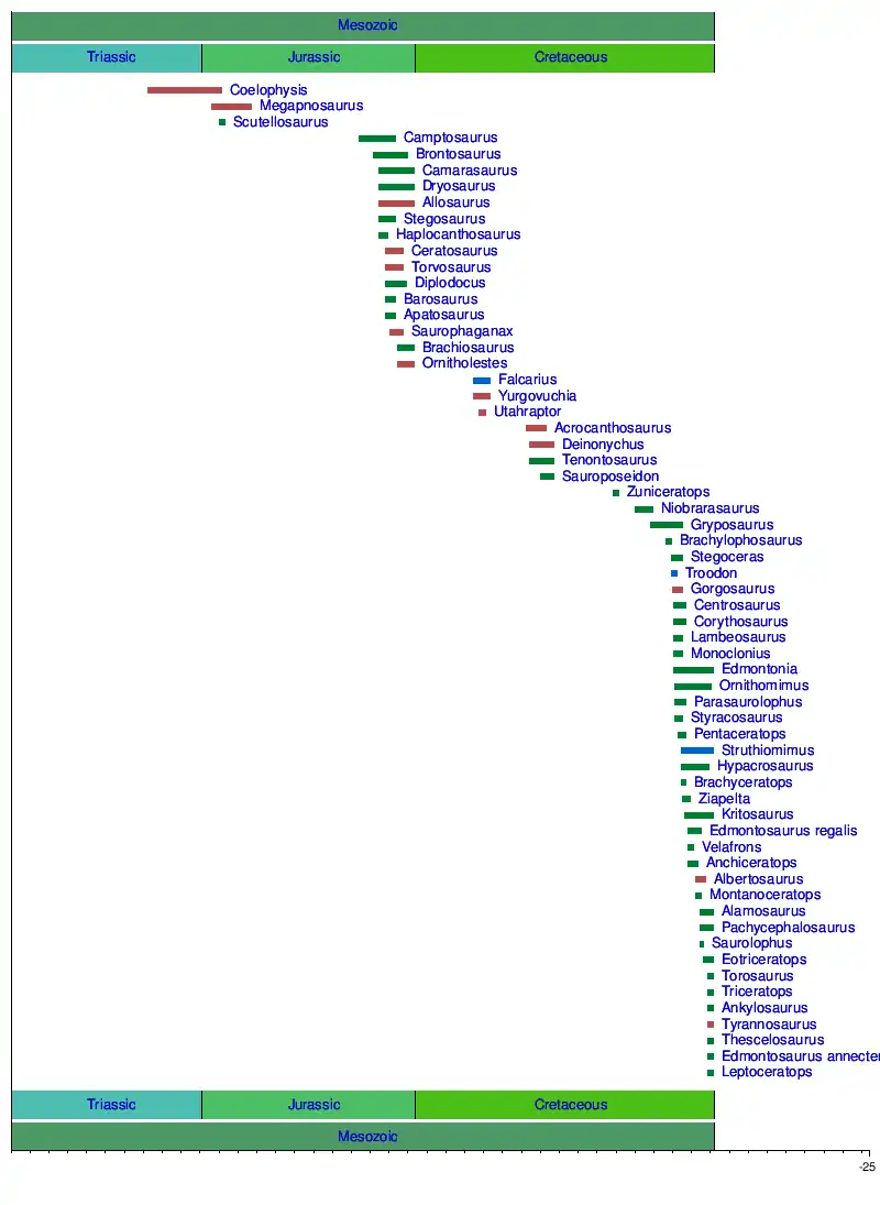 This is a timeline of selected dinosaurs from the list above. Time is measured in Ma, megaannum, along the x-axis.