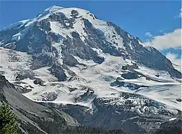 The North Mowich Glacier is a glacier located on the northwest flank of Mount Rainier in Washington. It covers 2.4 square miles (6.2 km2) and contains 9.5 billion ft3 (269 million m3) of ice.[1] Starting from the foot of Rainier's steep Mowich Face at about 9,600 feet (2,900 m), the glacier first consists of two lobes of ice that flow downhill to the northwest. The southern arm of the glacier is connected to the adjacent Edmunds Glacier. As the two sections of ice join up, they form a large, relatively flat plateau of ice ranging from 7,800 feet (2,400 m) to 8,300 feet (2,500 m).[2] This plateau is an unbroken expanse of ice except for Needle Rock, which pokes out of the glacier ice. From then on, the southern part of the glacier terminates at about 6,400 feet (2,000 m), while the northern, rocky arm flows down a glacial valley and ends at about 5,800 ft (1,800 m) in elevation.[2] The North Mowich Glacier gives rise to the North Mowich River.[1]