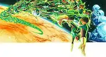 Green Lantern Corps member Hal Jordan, the Green Lantern of sector 2814 (which includes Earth), under the influence of the evil entity Parallax, kills all but one of the Guardians and most of the Corps before draining Oa's Central Power Battery of its energy.[3] During the final Zero Hour: Crisis in Time battle with Hal Jordan, Kyle Rayner destroys the planet in an attempt to defeat Hal.[4]