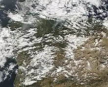 Satellite image depicting smoke from wildfires in Portugal and northwestern Spain on 8 October.