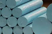 A stack of Turquoise Blue "Pigment Sticks" in the factory of R&F Handmade Paints in Kingston NY ready to be wrapped.