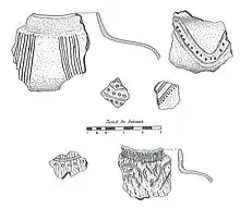 9,747 sherds were recovered in the 1947 excavations, with the pottery analysis based on 395 rim sherds and decorated body sherds.[9] In 1970–72, 3,746 sherds were recovered representing at least 64 vessels.[10]