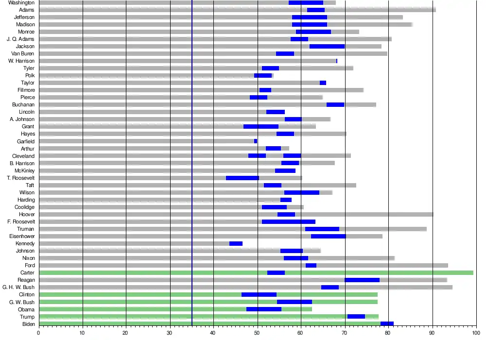 The following chart shows presidents by their age (living presidents in green), with the years of their presidency in blue. The vertical blue line at 35 years indicates the minimum age to be president.